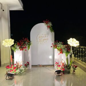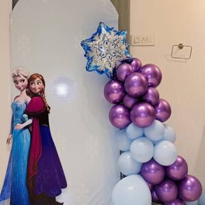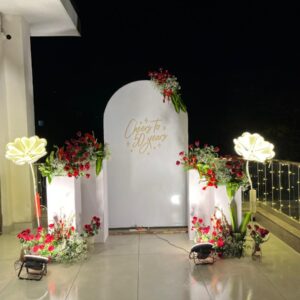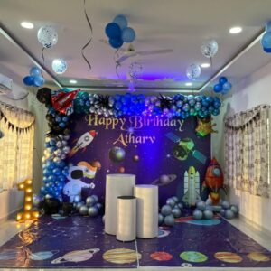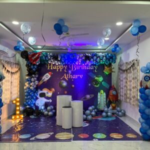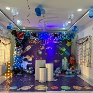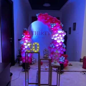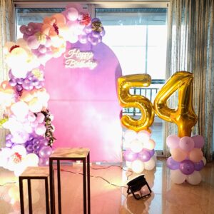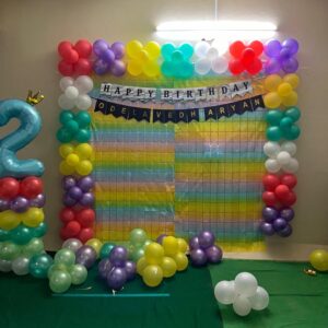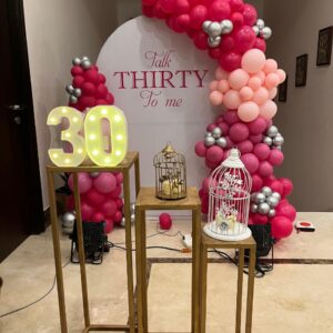 What we offer:- ✅A ring stand ✅Semi Arch of 180-200 chrome balloons as shown in the reference picture ✅1 6x6 round flex with customized baby photo printon it ✅Some balloon bunches on ceiling / side walls ✅1 LED number light ✅2 LED Power can light ✅2 plain white drum cake stand ✅Home Delivery & Setup – we come to your…