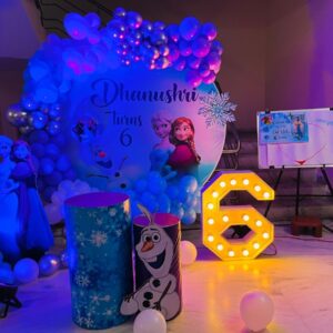 What we offer:- 180-200 Balloons Decoration as shown in the reference picture -No Helium customized theme print on flex(6x6 feet)-1pc happy birthday neon light -1pc cylindrical cake drum-2 pcs 40’’ number foil balloon on balloon pillar - 2 pcs balloon stands -2pc power cans -2 pcs marquee letter of name (as your requirement) some balloon bunches will be stick to…