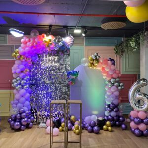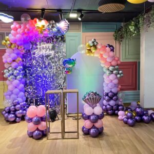 What we offer:- ✅1 ring stand ✅1 happy birthday neon light ✅Arch of 180-200 balloons as shown in the reference picture ✅2 cake stands ✅4-5 pcs Mermaid theme foil balloons ✅2 LED power can lights ✅40-inch, Age number foil – 1pc ✅2 Background square foil curtains ✅Home Delivery & Setup – we come to your location at the time you choose.…