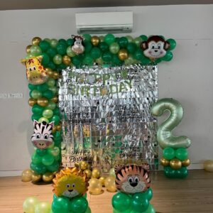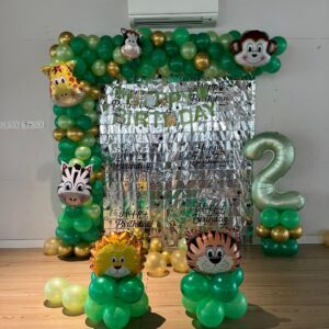 What we offer:- ✅150-180 Balloons Decoration -No Helium ✅75 metallic light green,75 metallic dark green,20 standard brown ,20 metallic yellow balloons ✅40’’ number foil - 1 pc ✅character foils -6pc ✅ birthday banner-1pc ✅background foil fringe curtain[3/6] -2pc ✅balloon pillar - 2pc ✅Home Delivery & Setup – we come to your location at the time you choose. ✅🛡 Safety First…