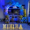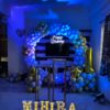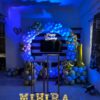 - Banners & Signs: A multi-colored “Happy Birthday” banner is displayed at the center of the backdrop. Below it, there is a pink banner with the name in large block letters.