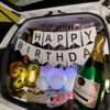 A large cluster of golden and white balloons fills the trunk space, while a sparkling “HAPPY BIRTHDAY”