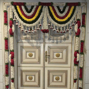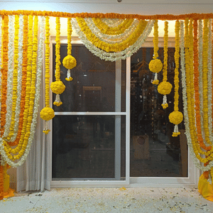- Complete marigold curtain entrance decoration designed to create a grand and traditional welcome for house warming ceremonies