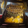 A large cluster of golden and white balloons fills the trunk space, while a sparkling “HAPPY BIRTHDAY”