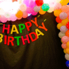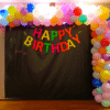 - Step into a world of color and cheer with this lively birthday setup that’s all about fun and festivity! A bold “HAPPY BIRTHDAY” banner in vibrant multicolor letters pops against a deep black backdrop, drawing all eyes to the center of the celebration.