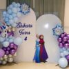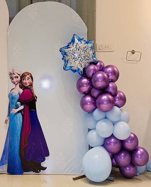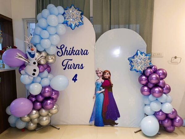 - The scene is beautifully styled with shimmering icy blues, soft purples, and sparkling silver balloons, creating an atmosphere straight out of Arendelle. Beloved characters Elsa and Anna stand gracefully on the backdrop, while the ever-cheerful Olaf joyfully peeks out from a balloon cluster, adding playfulness to the frosty elegance.