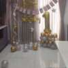 • Backdrop: Behind the decoration, there is a shiny gold fringe curtain that gives a festive look and serves as the background for the main setup.