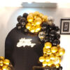 - 100–150 Balloons Decoration (No Helium) – beautifully arranged in black chrome and gold balloons to create a stylish Black Chrome Balloon Arch with Birthday Backdrop and tied with ribbons.