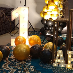 - 40–50 balloons with ribbons will be attached to the ceiling. The rest will be arranged around the black chrome balloon arch and birthday backdrop to create a stunning decoration.