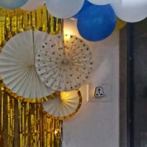 - 50-70 Balloons Decoration (No Helium) – beautifully arranged with ribbons in an elegant blue and gold color theme for a stylish birthday celebration.