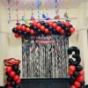 ● Balloon Arch and Pillars: There is a prominent balloon arch at the top made of alternating red and black balloons. On each side of the arch, there are balloon pillars composed of red and black balloons. The pillar on the right also features a large balloon shaped as the number, indicating the child’s age, while the left pillar has a Lightning McQueen foil balloon.