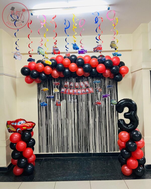 - The decoration in the image is designed for a child’s birthday party with a “Cars” movie theme. Key features of the setup include: