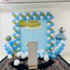 - The backdrop is made from a blue and white grid-patterned sheet, bordered by a large arrangement of balloons in blue, white, and yellow. The top center displays two gold balloons forming the number . Below that, yellow banners with white letters spell out “Happy Birthday,” and another banner is positioned beneath with more festive text.