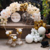 - 100–150 Balloons Decoration (No Helium) – beautifully arranged in white, gold, and metallic shades to create an elegant Elegant White and Gold Grid Backdrop Balloon Garland Kit with a stylish white and gold grid backdrop and a beautiful balloon garland, all tied with ribbons.