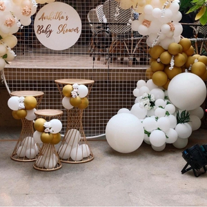 - 40–50 balloons with ribbons will be attached to the ceiling. The rest will be arranged around the white and gold grid backdrop with balloon garland to create a beautiful decoration.