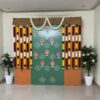 - Backdrop: Behind the decoration, there is a shiny gold fringe curtain that gives a festive look and serves as the background for the main setup.
