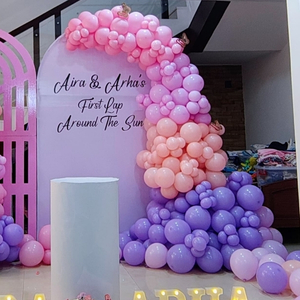 - 150-200 Balloons Decoration (No Helium) – beautifully arranged in a cute pink and purple theme for a lovely and memorable first birthday setup.