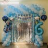 - The setup features a large balloon arch in sky blue and white, framing the top and sides of the backdrop.