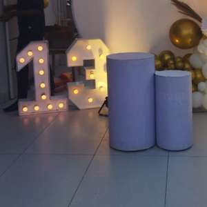 - Decorative Cake Plinth Stands: Elegant cylindrical plinth stands are arranged in front of the backdrop, making it a perfect place to display the birthday cake and other decorative items.