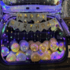 banner is hung across the back window inside the car, making the theme clear and festive. - Location and Setup :
