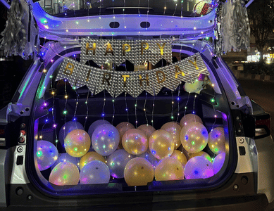 The decoration in the image is a festive car trunk setup featuring bright string lights,