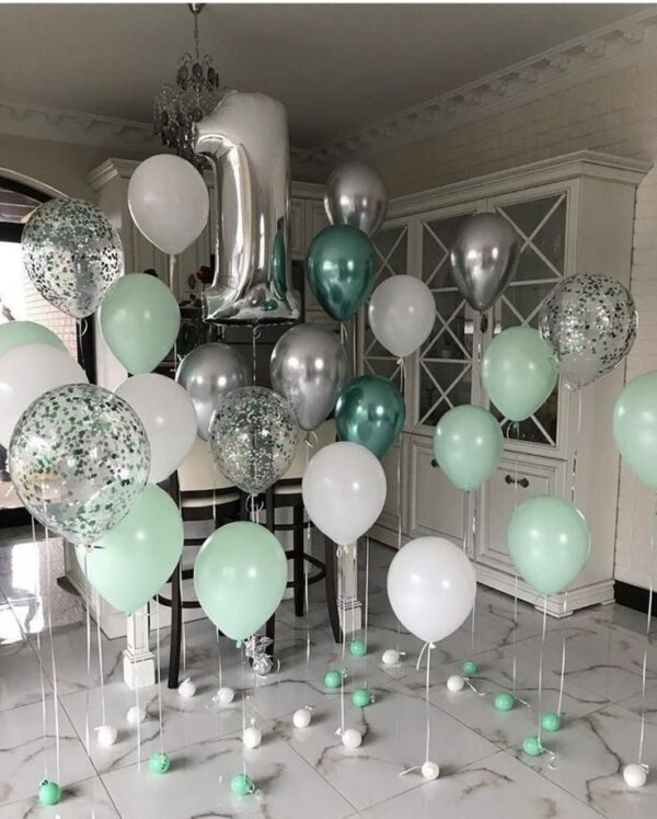 - 10 balloons with ribbons will be fixed to the ceiling. The rest will be arranged in bunches or left floating on the floor as per your choice.