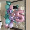 ● A character foil balloon on the right side, depicting a cartoon girl with blue hair, adding a fun, personalized touch. - Floor Balloons: The floor has several balloon scatters, including clear balloons with pink confetti inside, and more green balloons, enhancing the playful party atmosphere.