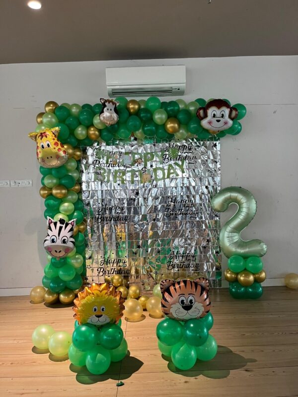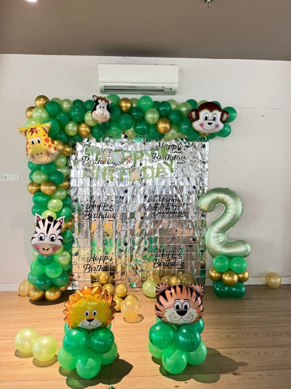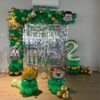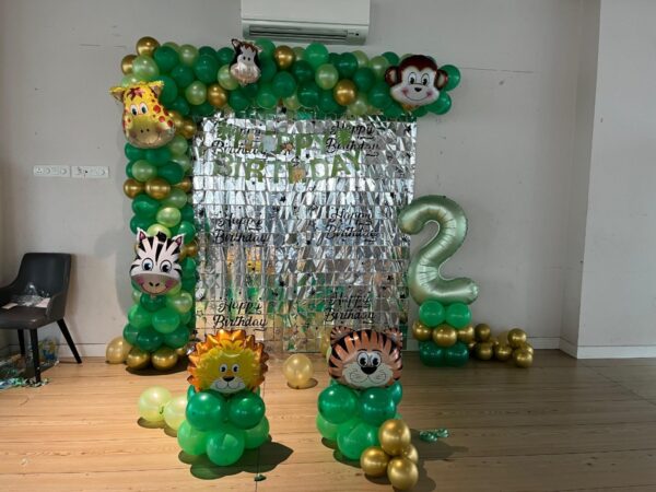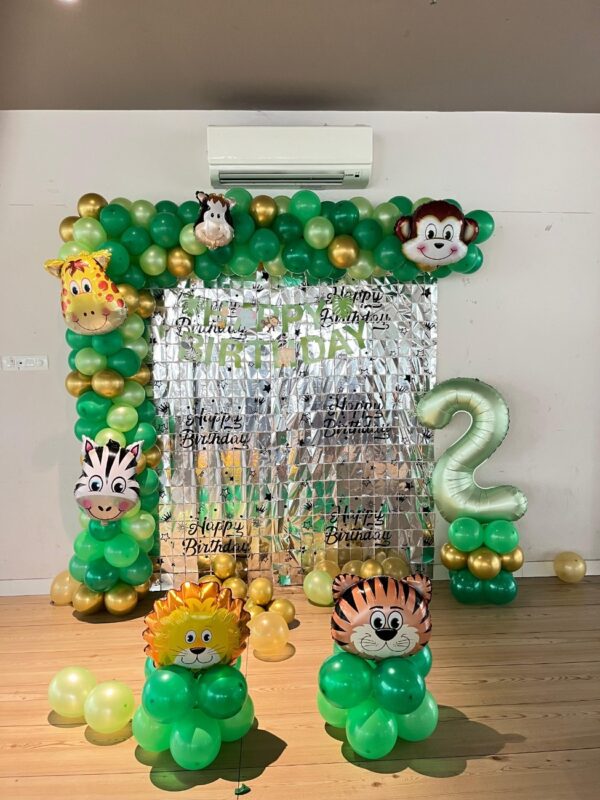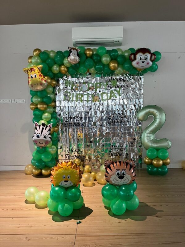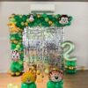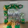 - Balloon Arch: The main structure consists of balloon columns on either side of a backdrop. The balloons are in shades of greenand some brown and yellow accent balloons, collectively resembling a forest or jungle environment.