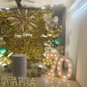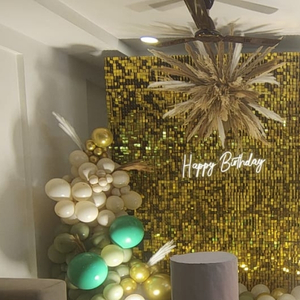 - 100–150 Balloons Decoration (No Helium) – beautifully arranged in sage green, champagne, and gold balloons to create a stylish setup with a luxury gold shimmer backdrop and tied with ribbons.
