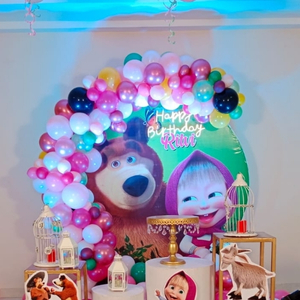 - 100–150 Balloons Decoration (No Helium) – beautifully arranged in bright and colorful balloons to create a fun Masha Cartoon Theme Balloon Arch with Birthday Backdrop and tied with ribbons.