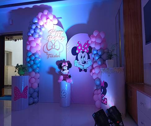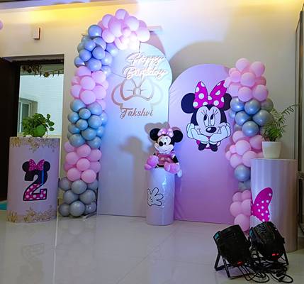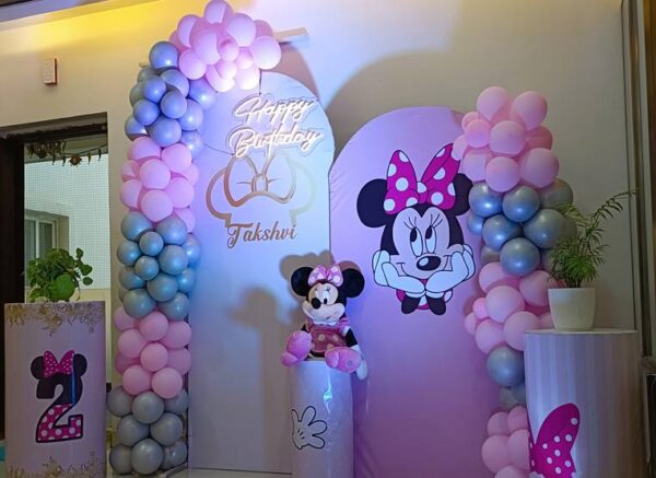 - A dual-panel Frame backdrop featuring a large illustration of Minnie Mouse and a personalized “Happy Birthday Takshvi” message.
