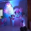- Pink and silver balloons create a playful and festive arch surrounding the backdrop.