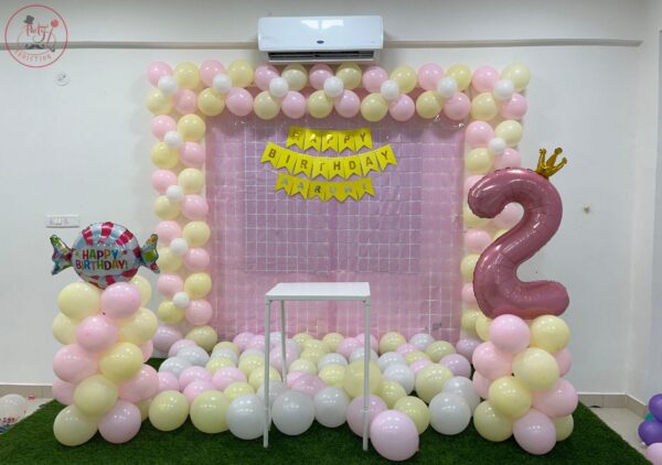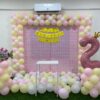• Backdrop: A rectangular frame is decorated with pastel yellow, pink, and white balloons arranged in an arch around the backdrop. The inside backdrop is made of a light pink mesh or grid.