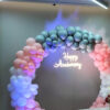 - 40–50 balloons will be arranged around the pink and white circular balloon arch to enhance the visual impact with the neon anniversary sign.