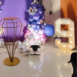 Party Addiction will decorate your space with 70-80 balloons and ribbons in a charming purple and pink butterfly theme, along with a balloon arch and butterfly themed backdrop to create a dreamy and joyful birthday party atmosphere.