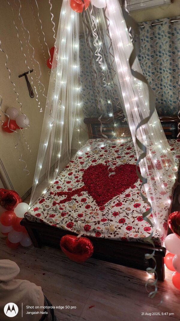- The decoration in the image features a romantic and festive setup, likely intended for a
