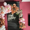 Party Addiction will decorate your space with 50-60 balloons and ribbons in a stunning rose gold and white theme, along with a balloon arch and floral themed backdrop to create a classy and charming birthday party atmosphere.