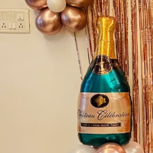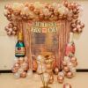 Party Addiction will decorate your space with 100–150 balloons and ribbons in an elegant rose gold theme along with a sequin backdrop and champagne bottle foil balloons, creating a glamorous bride-to-be party setup.