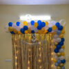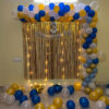 - 40–50 balloons with ribbons will be attached to the ceiling. The rest will be arranged around the royal blue and gold balloon decoration with foil fringe backdrop to create a beautiful decoration.