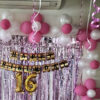 Roziya Pink Metallic Foil Fringe Curtain and Pink and White Balloon Decoration