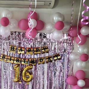 - 50-100 Balloons Decoration (No Helium) – beautifully tied with ribbons in pink and white for a festive and elegant look.