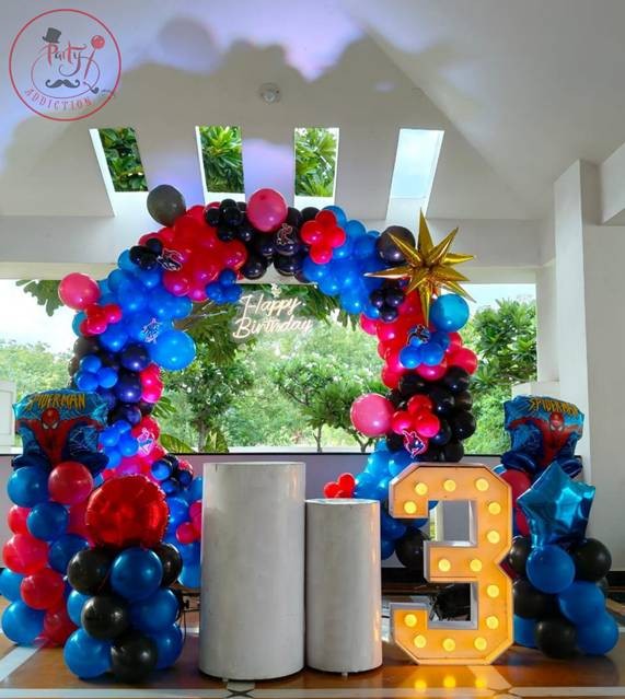 - Party Addiction will decorate your place with 200- 230 Balloons, a Spiderman theme on a ring to create the perfect party vibe.