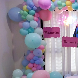 Party Addiction will decorate your space with a stylish hexagon backdrop paired with a stunning multi-color balloon arch made with 100–150 balloons with ribbons in bright and vibrant shades to create a lively and Instagram-worthy party setup.