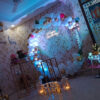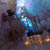 - 40–50 balloons with ribbons will be attached to the ceiling. The rest will be arranged around the white and gold circular balloon arch with neon sign to create a beautiful decoration.